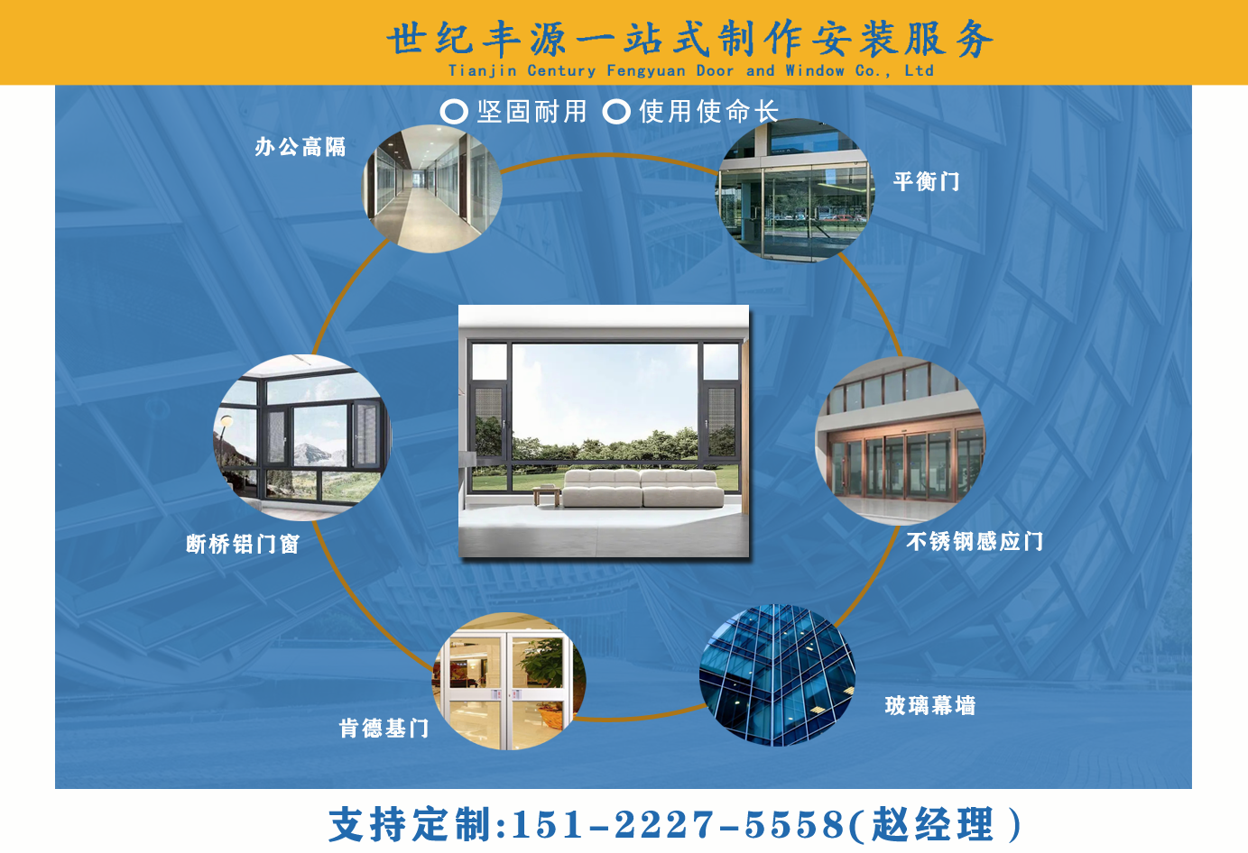 天津世紀(jì)豐源門窗有限公司從事斷橋鋁門窗,玻璃幕墻,平衡門,肯德基門,不銹鋼感應(yīng)門,百葉窗,辦公高隔,制作安裝一站式訂制生產(chǎn)及配套服務(wù)等。 公司自成立以來,始終堅(jiān)持以人才為本、誠信立業(yè)的經(jīng)營原則,薈萃業(yè)界精英,成熟的技術(shù)、管理方法及企業(yè)經(jīng)驗(yàn)與國內(nèi)企業(yè)的具體實(shí)際相結(jié)合,為企業(yè)供給各個(gè)方面的解決方案,使企業(yè)在激烈的市場(chǎng)競(jìng)爭(zhēng)中始終堅(jiān)持競(jìng)爭(zhēng)力,實(shí)現(xiàn)企業(yè)快速、穩(wěn)定地發(fā)展。 質(zhì)量好、服務(wù)好、才能信譽(yù)好,公司已在諸多領(lǐng)域取得輝煌成績(jī),愿意成為您可信賴的長期合作伙伴。 讓我們攜手同行,共同實(shí)現(xiàn)“讓普通老百姓都用得上高端門窗”...